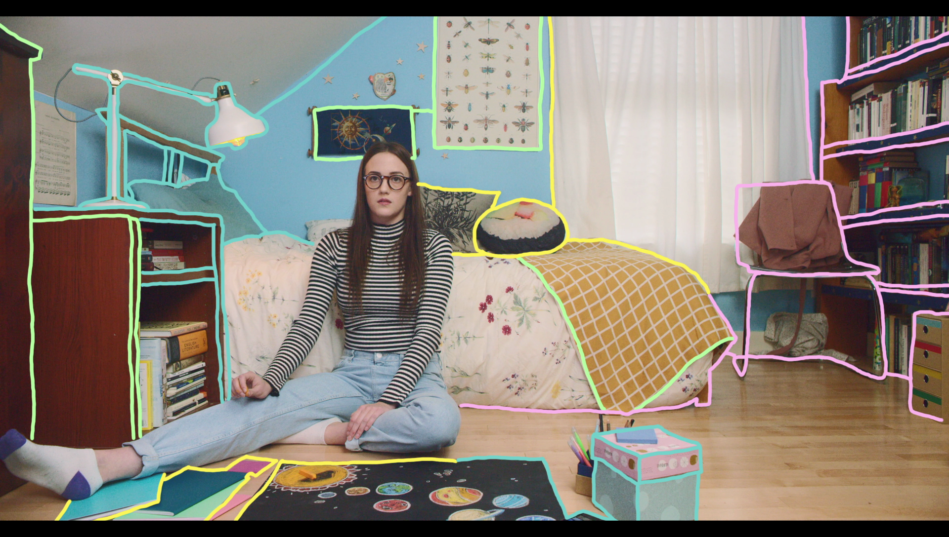 VAJ STILL 1 November 1, 2019 Return to: Violet and JuneFull resolution (1920 × 1088) Image navigation Previous Image Next Image Still from the film: Violet, in front of a drawing of our galaxy, sitting up and paralyzed with terror. There are bright, hand-drawn outlines around the objects in her room.